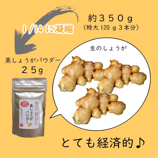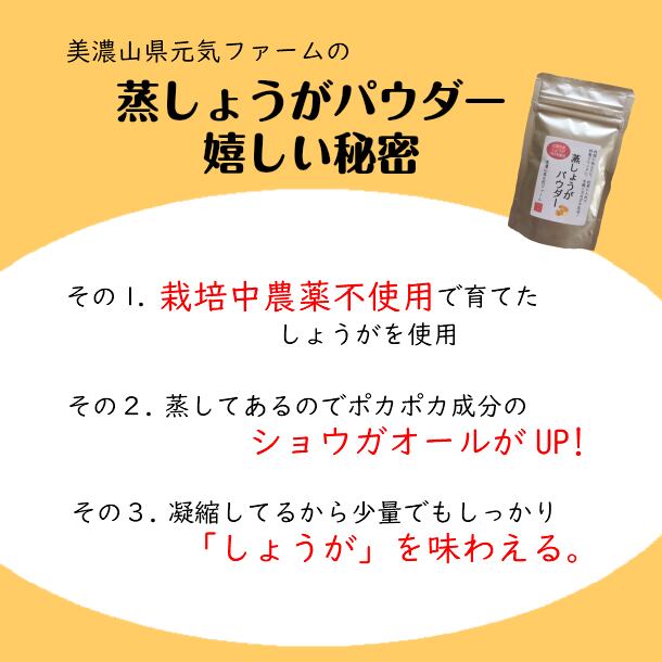 岐阜県山県(やまがた)市産のしょうがを100%使用しました。蒸してあるので、ぽかぽか成分であるショウガオールが入ってます。クーラーの冷えや、冷たいものの採りすぎによる体調が気になる方にもおすすめです。切ったり、卸したりというショウガを使う料理の面倒な手間が、一振りするだけで解消されます。